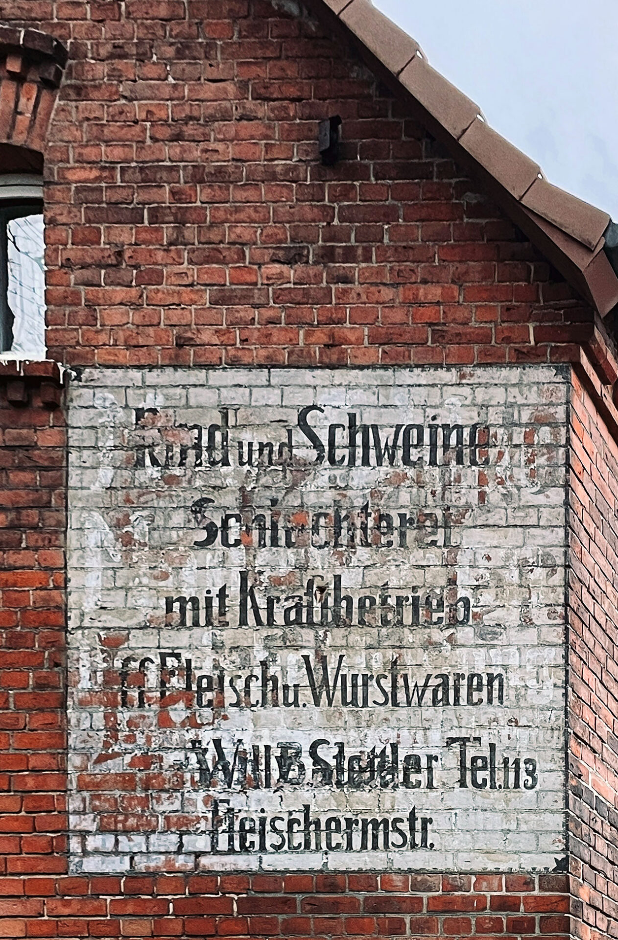 Alle Indizien bringen mich zu der Vermutung, dass die Werbetafel für den Fleischereibetrieb in ihrer ursprünglichen Form – mit dem übermalten, heute unkenntlichen ersten Inhaber und ohne Angabe der Telefonnummer – irgendwann zwischen 1910 und 1930 entstanden ist. Die übermalten Werbemotive im Hintergrund würde ich zeitlich zwischen 1880 und 1910 ansiedeln.