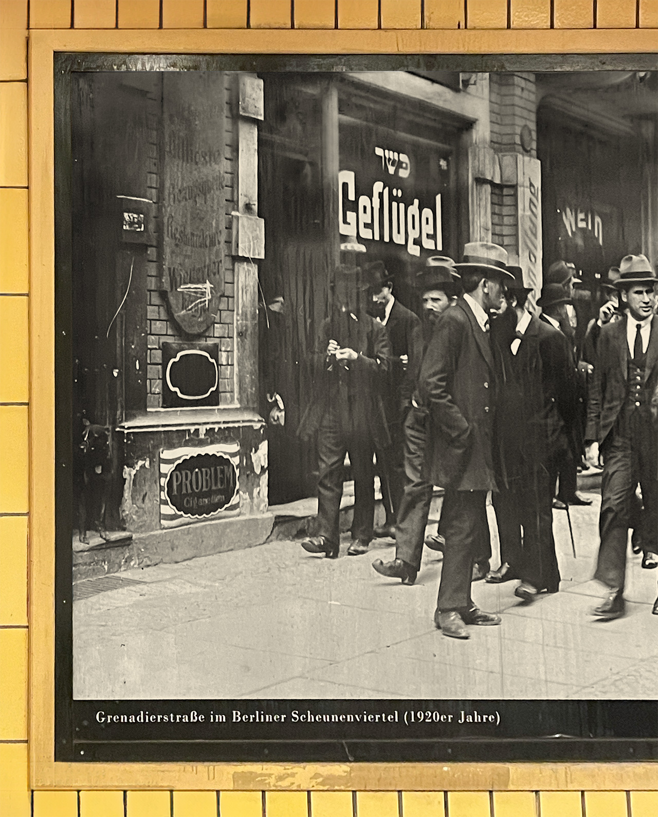 Auch kürzlich wurde ich wieder fündig, wenngleich an einem unerwarteten Ort: Beim Warten auf die U-Bahn am Berliner Bahnhof Rosa-Luxemburg-Platz stand ich auf dem Bahnsteig zufällig gegenüber einem Motiv einer ganzen Reihe historischer Aufnahmen aus Berlin, welche hinter dem Gleisbett an der gekachelten Wand im 18/1-Plakatformat angebracht sind. Und auf dieser Aufnahme des Pressefotografen Willy Römer aus den 1920er-Jahren sieht man eine Gruppe Passanten – ausschließlich Männer – vor einem jüdischen Geschäft in der damaligen Berliner Grenadierstraße, die 1951 in Almstadtstraße umbenannt wurde. Auf einem Schaufenster des Ladens befindet sich die zweisprachige Beschriftung כּשר (hebr.: »koscher«) und darunter »Geflügel« – mit einem g, das die typisch angeschnittene Unterlänge des »Danish g« aufweist! Dieser Schnappschuss von mir sei das typographische Montagsbonbon für heute.