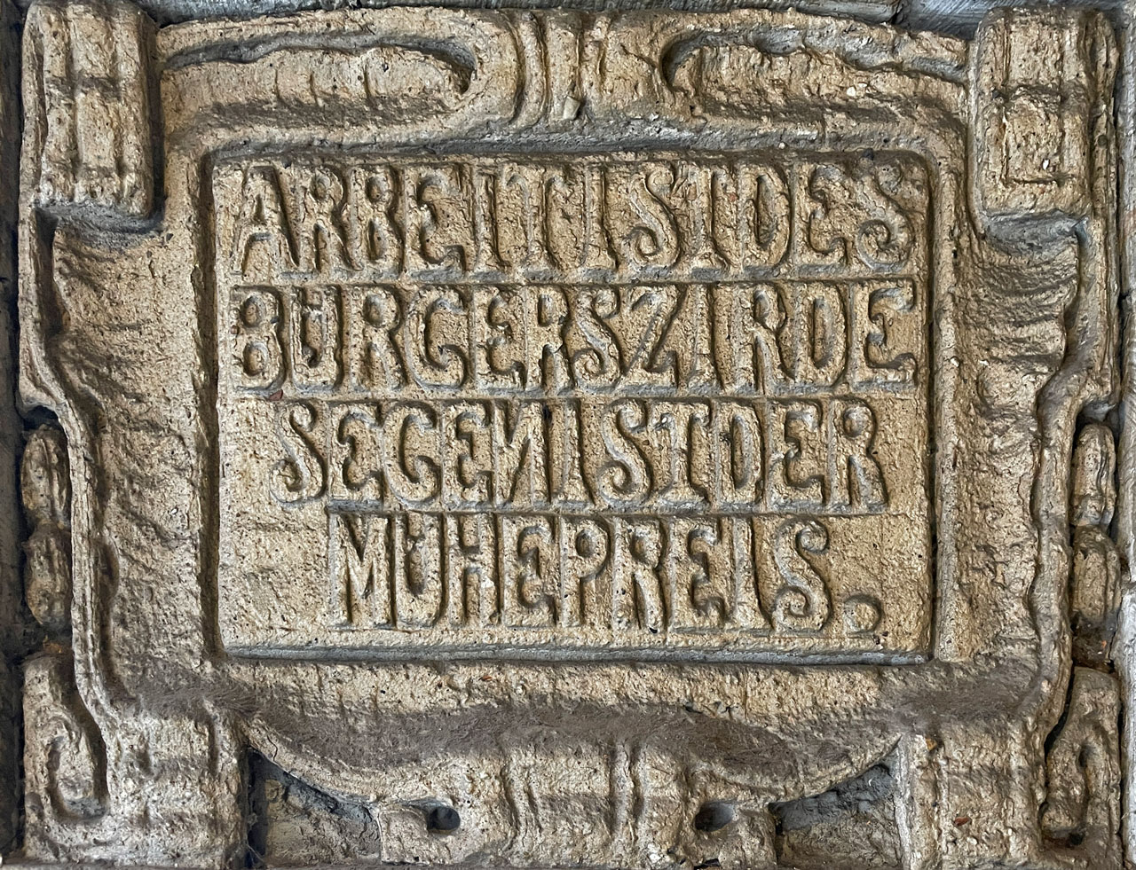 Typographisch interessant sind bei dem Relief aus meiner Sicht zudem fünf weitere Details: Zum einen das nahezu völlige Fehlen von Leerzeichen zwischen den Wörtern. Mit einer etwas kleineren Schrift oder einem schmaleren Rahmen um das Textfeld wäre dafür ja durchaus Platz vorhanden. Es muss also eine bewusste Entscheidung gewesen sein. Auch auf Interpunktion innerhalb des Textes hat die künstlerisch verantwortliche Person verzichtet, lediglich am Ende wurde ein Punkt gesetzt. Die dritte Besonderheit sind die sehr dezenten Miniatur-Ü-Punkte, die in den Wörtern »BÜRGERS« und »MÜHE« regelrecht im U »versenkt« wurden. Hier mag tatsächlich der Grund gewesen sein, in der Höhe Platz zu sparen, um die Zeilen möglichst eng setzen zu können.