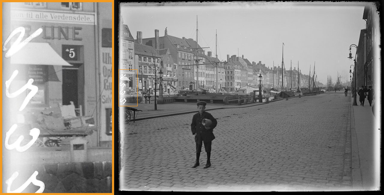Ein wahrer Glücksfund bei der Recherche war ein hochauflösendes historisches Motiv des dänischen Fotografen Peter Elfelt (1866–1931) aus dem Bestand digitaler Fotografien der Königlichen Dänischen Bibliothek. Ganz links am Rand kann man darin (inklusive der Hausnummer 5) das heutige Wirtshausgebäude erkennen. Anhand der im Kanal vertäuten Schiffe wird das Bild in Forendiskussionen datiert zwischen 1906 und 1931. Damals befanden sich an der Fassade, wie man sieht, noch die Werbeschriftzüge der Reedereien. Der Schriftzug »Nyhavns Færgekro« muss also zwischen frühestens 1911/12 (Zeitraum des Ticketverkaufs für die »Titanic«) und ca. 1930 (Motiv der o.g. Postkarte) angebracht worden sein.