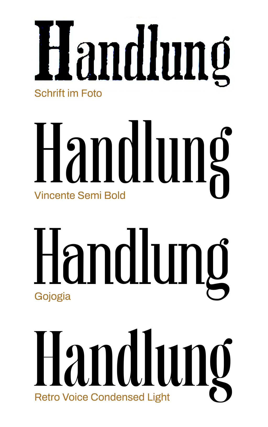 Die verwendete Schriftart könnte eine Version der »Folio« sein (Walter Baum/Konrad Friedrich Bauer für die H. Berthold AG, 1956), zu erkennen an dem fast kreisrunden O sowie dem senkrechten Bein des R, das an der Basis mit einem leicht gebogenen Schwenk nach rechts abschließt.