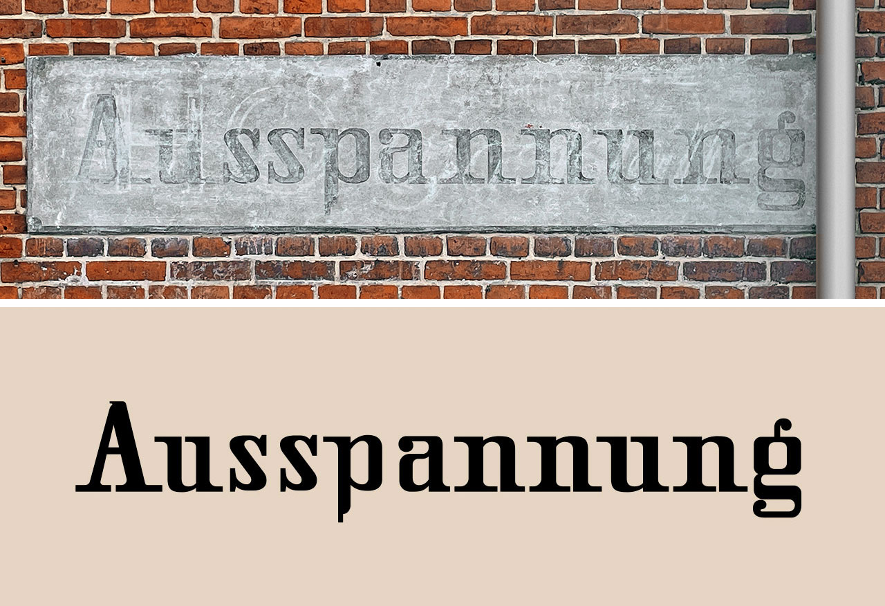 Bei dem älteren Schriftzug »Ausspannung« fand ich zudem die Ähnlichkeit des kleinen g mit dem kleinen g in einem anderen historischen Werbemotiv aus Trebbin spannend, rund 100 km Luftlinie entfernt, das in meinem Foto zum Blogbeitrag vom 20.03.2026 auftaucht und dessen Entstehungszeit ich auf Ende des 19. Jahrhunderts geschätzt hatte. Vielleicht wurden ja beide Motive etwa zur selben Zeit angebracht?