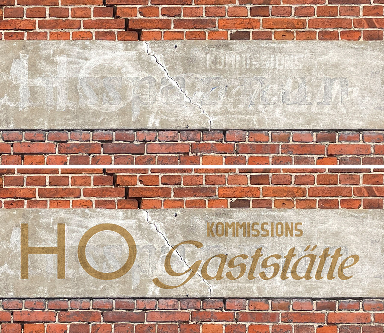 Bestätigt wird die Annahme, dass es sich um ein Wirtshaus handelt, auch hier wieder durch ein »Geisterbild« des Wortes »Gaststätte«, das in der rechten unteren Ecke der bemalten Fläche schemenhaft erhalten blieb. Die exakte typographische Gestaltung ist zwar auf diesem Wandbild auf der Nordseite nicht mehr rekonstruierbar, aber – o Wunder! – auf der Südseite desselben Gebäudes befindet sich direkt gegenüber ein zweites, gleich großes Motiv, auf dem zwar der Schriftzug »Ausspannung« deutlich schwächer erkennbar ist, aber die Gaststättenwerbung die Zeit besser überdauert hat. So konnte ich mithilfe kontrastverstärkender Bildfilter und anderen Nachbearbeitungen ziemlich gut rekonstruieren, wo der Schriftzug stand, wie er in etwa proportioniert war und was dort auf den anscheinend identisch beschrifteten Flächen einst stand. Links sind die beiden Großbuchstaben »HO« erkennbar – die Beschriftung bewarb somit eine »HO-Gaststätte«, eine Kette mit Restaurantbetrieben, die von 1948 bis 1990 in der ehemaligen DDR betrieben wurde. Und auf dem zweiten Wandbild ist klar erkennbar, dass es sich um eine »KOMMISSIONS(-)Gaststätte« handelte.