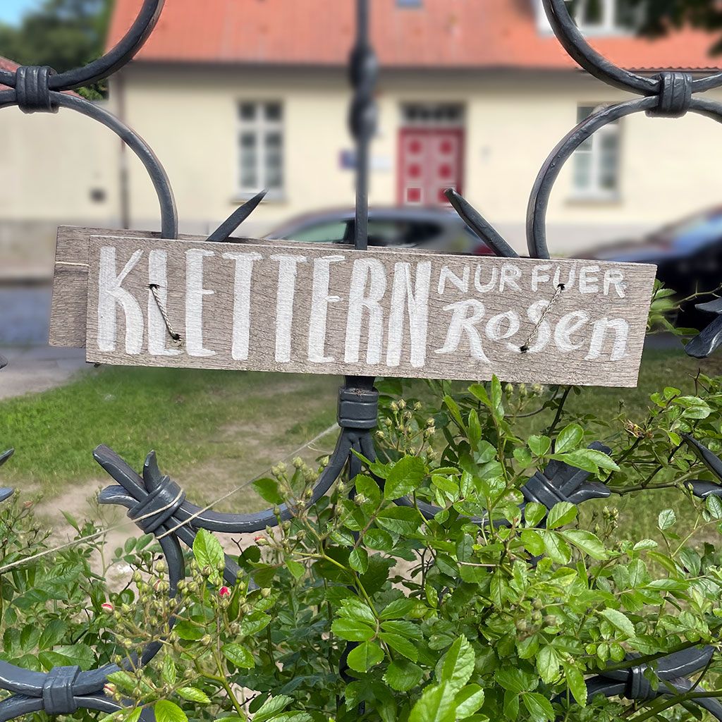 Im Abstand mehrerer Monate habe ich jedoch zwei Verbotsschilder fotografiert, die beide etwas anders machen. Das erste begegnete mir kürzlich auf einem Kirchhof in Greifswald und richtet sich vermutlich an Eltern und deren Kinder, die sich von dem berankten Eisengitter, an dem das Schild hängt, zum Klettern animiert fühlen. Ich mochte den freundlichen Tonfall des Schildes ebenso wie das Material und die handgeschriebenen Schriftzüge. Die Botschaft wird deutlich ausgesprochen, aber bietet Anlass zu einem Schmunzeln.