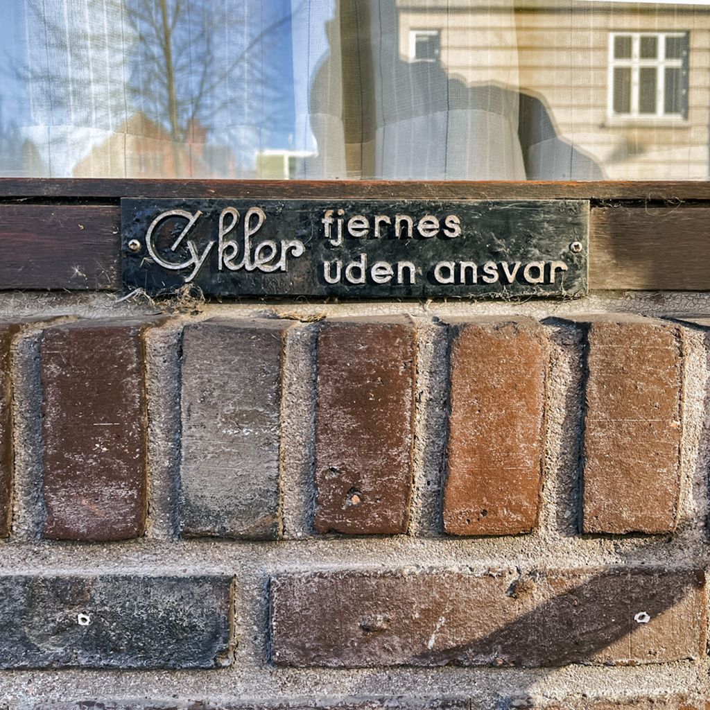 Das zweite Schild knipste ich vergangenen März in Kopenhagen. Dass es um Fahrräder geht, war mir klar, aber ich ließ es mir nachträglich komplett übersetzen und dort steht sinngemäß »Widerrechtlich abgestellte Fahrräder werden entfernt«. Ohne Ausrufezeichen und mit einem hübsch verschnörkelt gestalteten Substantiv am Anfang. Mir sagt diesen Schild, dass die Person, die es anbrachte, prinzipiell gut gelaunt ist, es sei denn, die angesprochenen Radfahrer setzen sich über dieses Verbot hinweg.