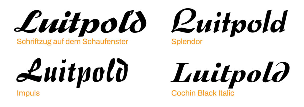 Der Name des Ladens, der Ende 2022 durch die ehemaligen Landschaftsgärtner Thomas Weisser und Nico Winterhalter übernommen wurde und sich somit aktuell nicht mehr im Familienbesitz befindet, ist in einer fetten Kursive mit teilweise verbundenen Buchstaben gesetzt, die ich gefühlt irgendwo zwischen den 1930er und 1960er Jahren verorten würde. Die auffallendsten Zeichen sind aus meiner Sicht das große und kleine L, sowie das d. Sehr wahrscheinlich wurde die Schrift – gewiss von einem professionellen Schildermaler – seinerzeit von Hand auf die Glasflächen aufgetragen, wie der erodierte Pinselduktus der Farbflächen erahnen lässt. Insofern war ich nicht überrascht, keine 100%ig übereinstimmende kommerzielle Schriftart dafür zu finden. Aber es gibt ein paar Favoriten, die für mein Auge eine recht ähnliche Anmutung (oder »look and feel«) haben.