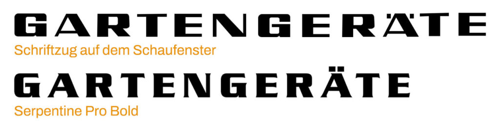 Die zweite Zeile mit ihren kantigen, fast »techno-artig« wirkenden Buchstaben wirkt da schon weitaus moderner. Als optisch sehr ähnliche Schrift fiel mir sofort die »Serpentine« des US-Designers Dick Jensen ein, die er 1972 für die Visual Graphics Corporation entworfen hat. Sie läuft zwar nicht ganz so breit wie die Unterzeile auf dem Fenster, aber auch hier stimmt m.E. die Anmutung.
