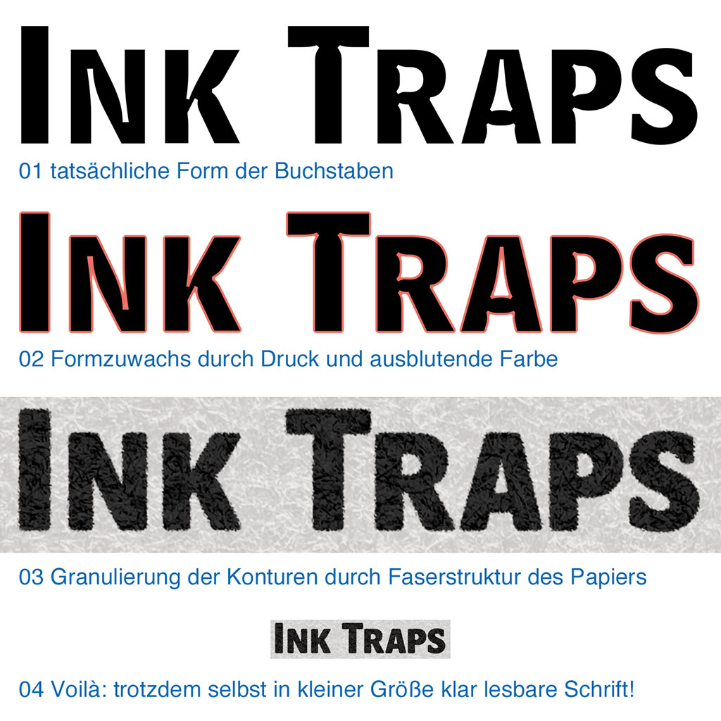 Diese eigenwillige Formgebung hat tatsächlich einen historischen Ursprung, der in einer realen Herausforderung begründet liegt, die früher™ beim analogen Druckprozess auftrat: Wurden nämlich, z.B. beim Hochgeschwindigkeitsdruck von Telefonbüchern die sehr kleinen Texteinträge – zudem auf dünnem, saugfähigen Papier – gedruckt, dann beeinträchtigte der Druckprozess die Formen der Buchstaben. Durch Pressdruck und Geschwindigkeit in der Druckmaschine sowie durch die vom Papier aufgesogene Farbe wurden die gedruckten Buchstaben fetter als die ursprüngliche Druckform. Dies führte dazu, dass kleine Zwischenräume (z.B. in a, e) zuliefen und der Text schwerer lesbar wurde. Um dies vorab zu kompensieren, erfanden Schriftgestalter die sog. »Ink Traps« – Einkerbungen in den Formen der Buchstaben, die sich beim Druckprozess gezielt mit Druckfarbe füllen, so die Buchstabenform »nachträglich korrigieren« und somit die gedruckte Schrift lesbar halten. Wie ein Porzellanteller beim Brennen um ca. 10% schrumpft und somit vor dem Einstellen in den Ofen entsprechend größer sein sollte, damit er hinterher als fertiges Geschirrstück die gewünschte Endgröße hat, wird hier bei der Schriftgestaltung gearbeitet – nur in umgekehrter Richtung.