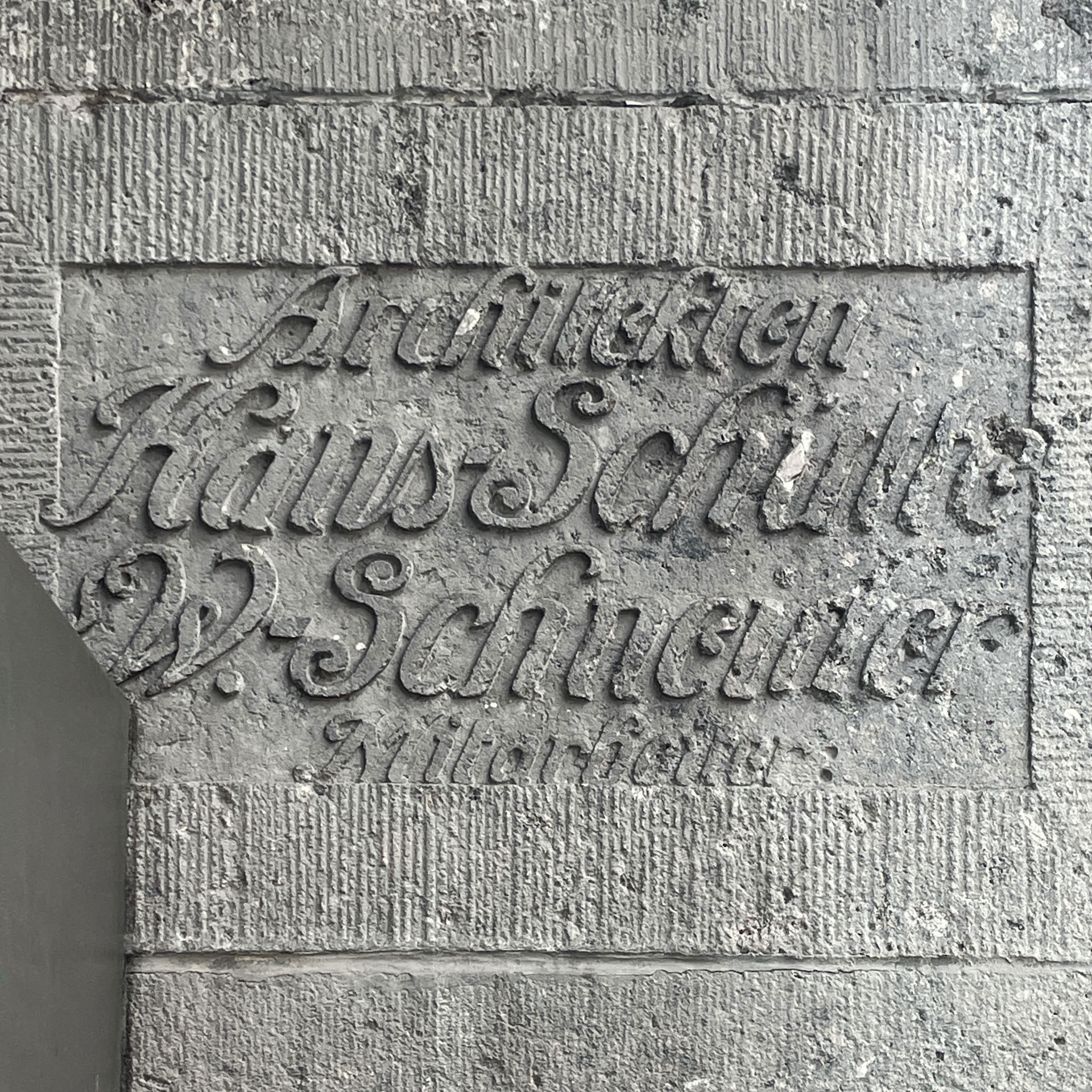 Die gemeißelte Inschrift ist zwar nicht deckungsgleich mit den recherchierten Schriftarten, aber sowohl ihre »hybride« Anmutung zwischen Schreib- und Druckschrift und etliche formale Details lassen dennoch eine große Verwandtschaft erkennen. Vermutlich wurde der Schriftzug eigens für die auftraggebenden Architekten gestaltet, was auch die Unterschiede zwischen mehrmals vorkommenden gleichen Buchstaben (am deutlichsten z.B. bei den beiden S) bekräftigen.