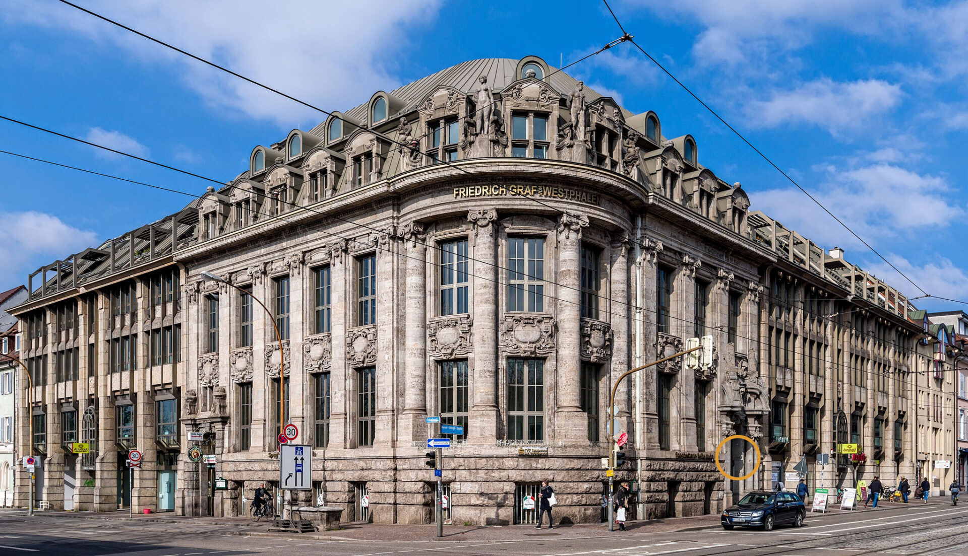 »Hier erwarb Anfang des Jahres 1909 die seit 1906 in Freiburg ansässige Dresdner Bank das Eckgrundstück Schreiber-/Kaiserstraße. Sie ließ das darauf stehende Wohngebäude abreißen und begann Mitte des Jahres mit der Errichtung eines Neubaus. Geplant und ausgeführt wurde das imposante Gebäude von den Architekten H. Schütte und W. Schneider. Die Fassade, ganz aus Muschelkalk (Würzburg) und Granitgestein (Yach), wurde im barocken Erscheinungsbild, aber auch unter vom Jugendstil geprägten Einfluss gestaltet.«