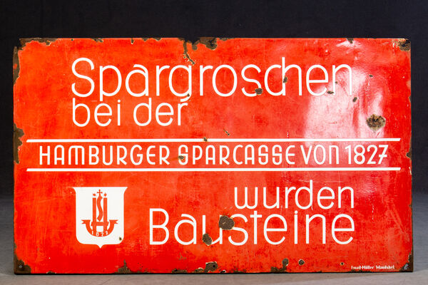Doch zurück zu der sonderbaren Formulierung. An einem ganz anderen Ort, auf einer schwedischen (!) Website, fand ich dann noch ein zweites, emailliertes Schild derselben Sparkasse – und auf diesem wurde der sinngleiche Satz in einer abweichenden Wortfolge formuliert. Dort steht (übrigens ebenfalls in einer sehr schönen Schriftart): »Spargroschen bei der Hamburger Sparcasse von 1827 wurden Bausteine«.
