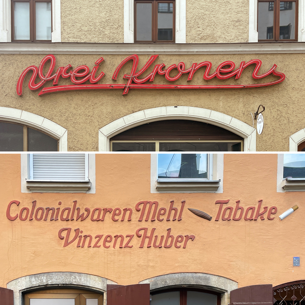 Diese Woche präsentiere ich gleich neun typographische Fundstücke auf einmal und ausnahmsweise auch mal ohne langen erklärenden Text. Es sind beiläufige Schnappschüsse schöner oder interessanter Buchstabensichtungen, die ich während meines Pfingsturlaubs in den Kirchen und Gassen Regensburgs eingefangen habe. Es war mir wieder einmal ein Vergnügen, abseits meiner kulturellen und kulinarischen »Verpflichtungen« in dieser schönen historischen Stadt auf Fotosafari gehen zu können. 🙂 📸 🔠