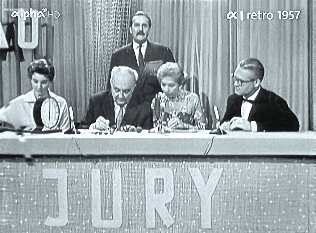 Während ich dieses TV-Relikt teils ungläubig, teils entsetzt und teils amüsiert verfolgte, fiel mir auf dem Tisch der Jury die wie aus Papier ausgeschnitten wirkende Beschriftung mit ihrem kess angeschrägten R auf. Und dieses Detail musste ich natürlich gleich einmal festhalten.