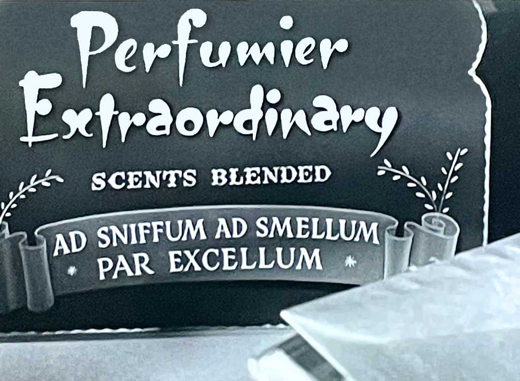 Das zweite Fundstück ist die – auch inhaltlich – originelle Beschriftung des Ateliers eines Parfumeurs, der in Episode 25 »Fit für Mord« (»How to succeed … at murder«) der vierten Staffel der Kultserie »Mit Schirm, Charme und Melone« (1966) eine Nebenrolle spielte. Bemerkenswert ist neben dem kreativ verballhornten »lateinischen« Motto des Duftkünstlers vor allem der aus tropfenförmigen Elementen erstellte Firmenschriftzug »Perfumier Extraordinary«, dessen Schriftart ein wenig an den Font »Croissant« (1978) erinnert. Auch dieses typographische Requisit war mir einen spontanen Screenshot wert. 🤓 🔠 📺