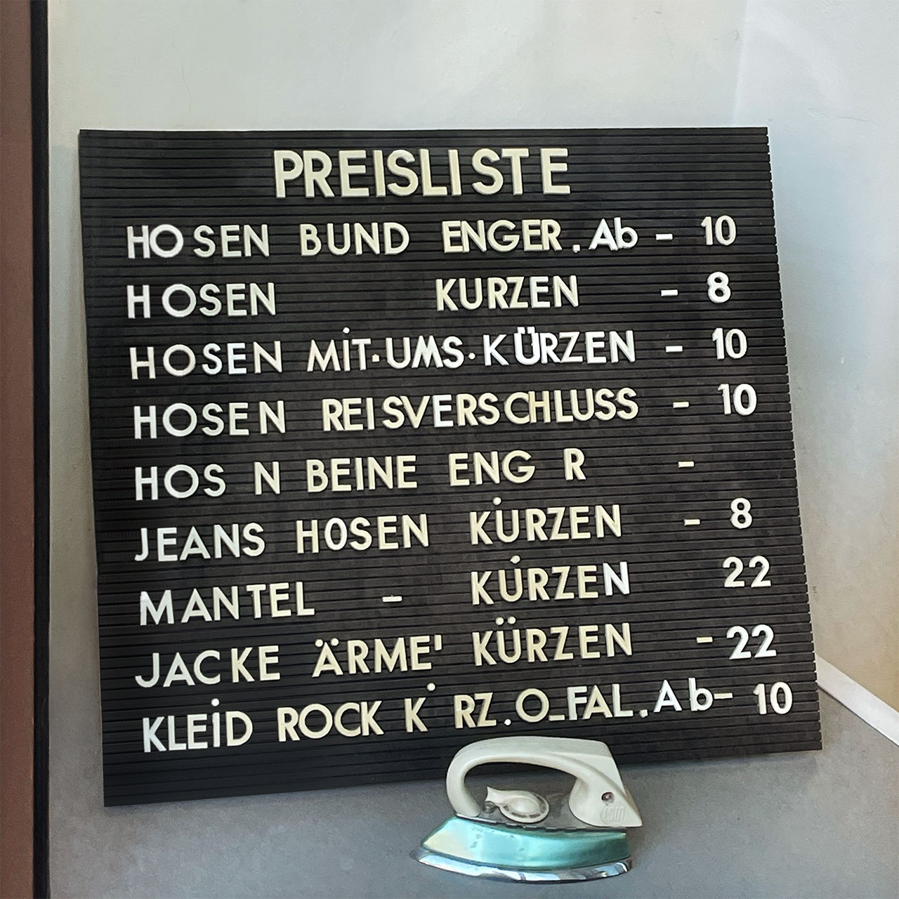 Die Tafel im Bild ist eigentlich nichts Besonderes; sie fiel mir hauptsächlich deshalb auf, weil sie sich im Umfeld der benachbarten Geschäfte von den glatten, digital gedruckten oder mit Folienbuchstaben beklebten Schaufenstern auf eine fast anachronistische Art abhob. Ein paar kuriose Details könnte man noch anmerken, zum Beispiel den gekürzten REISVERSCHLUSS in der vierten Zeile oder die JEANS H0SEN in der sechsten Zeile, bei denen das O durch eine Null ersetzt wurde, vermutlich, weil der O-Vorrat erschöpft war. Einige I wurden mit İ-Punkten geschmückt, andere nicht. Ein paar vereinzelte Ü-Punkte fallen auf, denen ihr Zwilling abhandengekommen ist. In der dritten Zeile sind selbige zwar vollständig, aber nicht wie sonst überall rund, sondern quadratisch. Und in der vorletzten Zeile ist vom L nur noch ein apostrophartiger Stummel vorhanden, einige Buchstaben fehlen komplett.