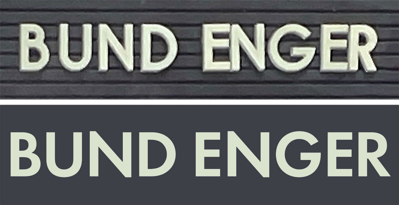 Die Schriftart erinnert stark an die Futura, wobei im direkten Vergleich auffällt, dass viele Zeichen der Steckschrift (D, N, R, U) schmaler gestaltet sind – wahrscheinlich, um Platz zu sparen. Zudem sitzt die »Mittelachse« bei den Buchstaben B, E und F deutlich höher als bei der Futura. Aber eine enge Verwandtschaft ist nicht zu leugnen.