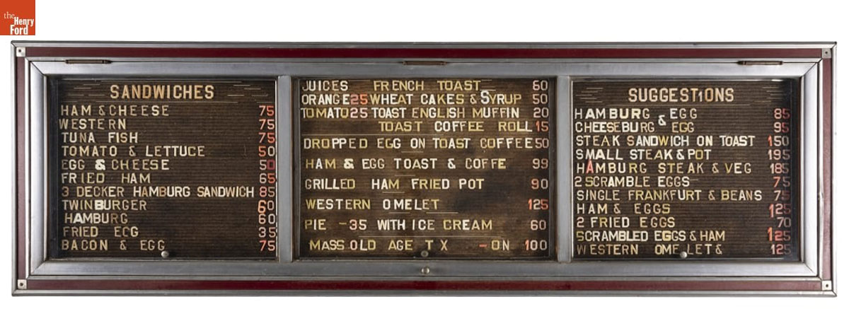 Und auf der Website des Henry Ford Museum findet sich das Foto eines Original-Exponats aus dessen Sammlung, das ich hier sogar mit Quellenangabe abbilden darf – ein Speisekarten-Triptychon aus einem Diner. Ein bisschen nähergekommen bin ich dem Ursprung also doch noch … 🙂