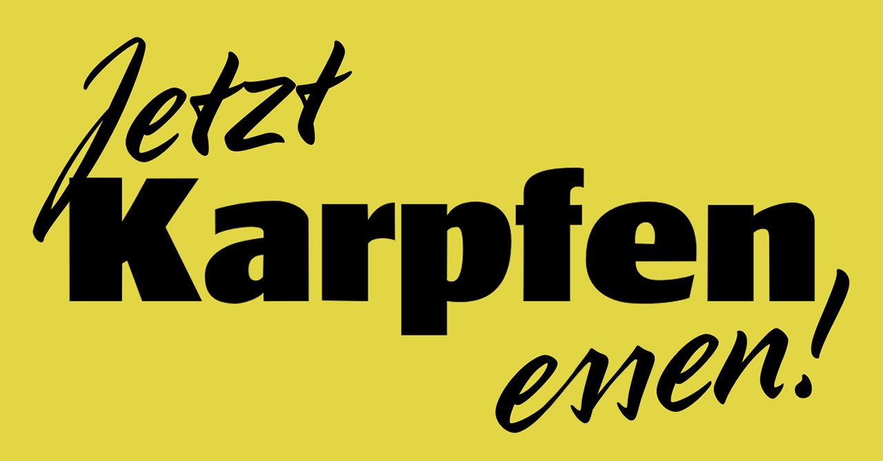 Auch Fisch und Meeresfrüchte sind beliebte Gerichte an Weihnachten und Silvester: Räucherlachs, Garnelencocktail, Hummersuppe oder delikate Fischsalate stehen auf dem Speiseplan. Und – Karpfen. Mich selbst hat dieser Fisch, auch nach mehrmaligem Probieren und in wechselnden Zubereitungsarten, nie wirklich begeistert. Wohl aber in Form dieses famosen Posters, das ich kürzlich während des Wartens in der Kundenschlange bei meinem lokalen Hamburger Fischfachgeschäft an der Wand neben dem Tresen hängen sah und das heute das typographische Fundstück der Woche sein soll. Die Farben! Die Schriften! Die Illustration! Für mich wieder eines dieser kuriosen, aber wunderschönen Werbemotive (ähnlich der dreieckigen Papiertüte mit dem Aufdruck »Esst mehr Früchte und Ihr bleibt gesund!«), die seit den 1950-er oder 1960-er Jahren irgendwie in kleinen Spezialitätengeschäften und auf Wochenmärkten bis heute überlebt haben und nach wie vor genutzt werden.