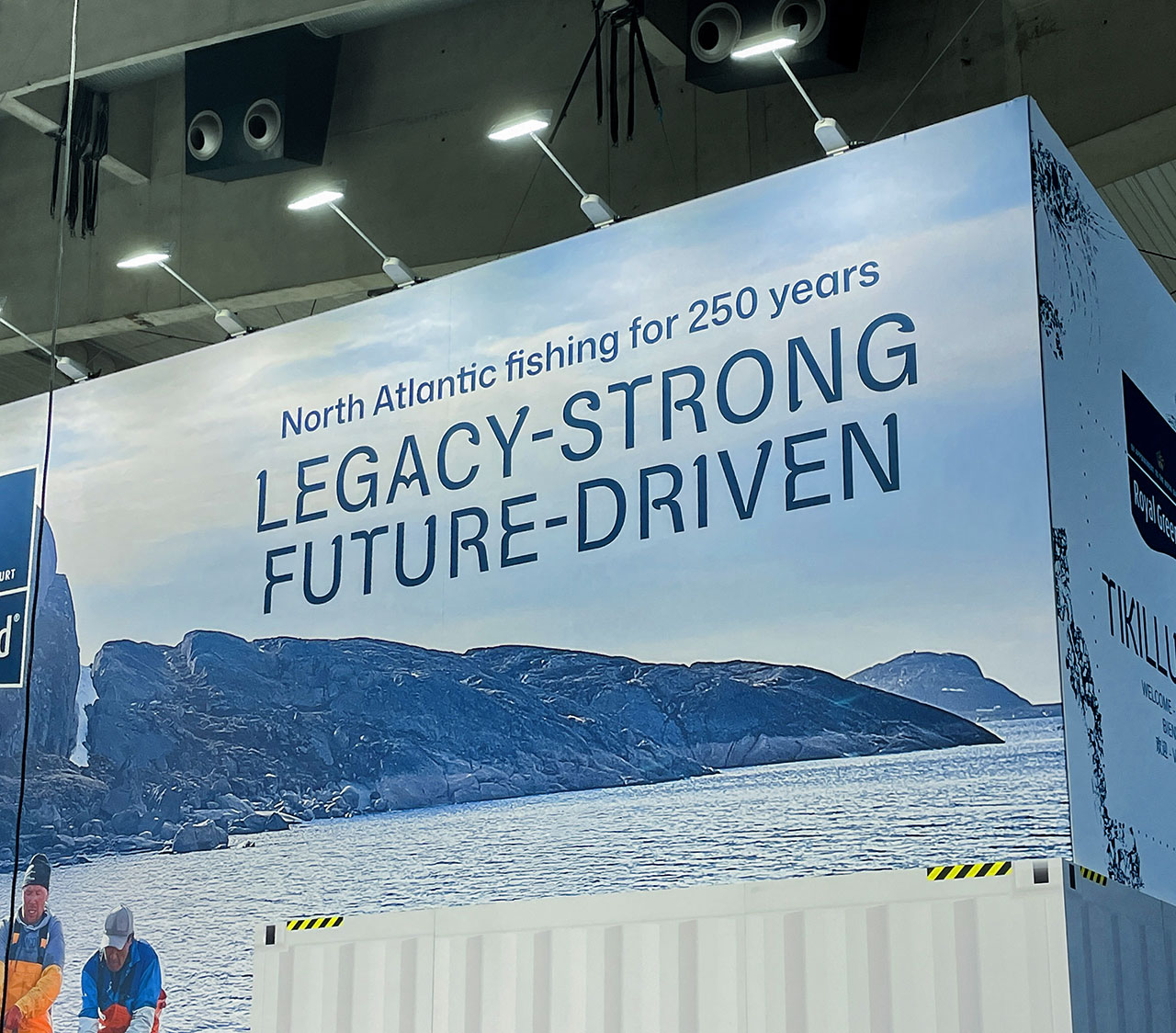 Wie erfreut war ich dann auch, auf meinem Streifzug über das Messegelände ein Unternehmen anzutreffen, das es ebenfalls anders und besser gemacht hat: Das Fischerei- und Fischverarbeitungssunternehmen Royal Greenland – gegründet 1774 als königlich grönländischer Handelsbetrieb. Schon von weitem fiel mir die ungewöhnliche, im Versalsatz genutzte Headline-Schrift auf, die den aktuellen Slogan »LEGACY-STRONG – FUTURE-DRIVEN« hoch über den Köpfen der Besucher vom Messestand aus in die Halle sendete.