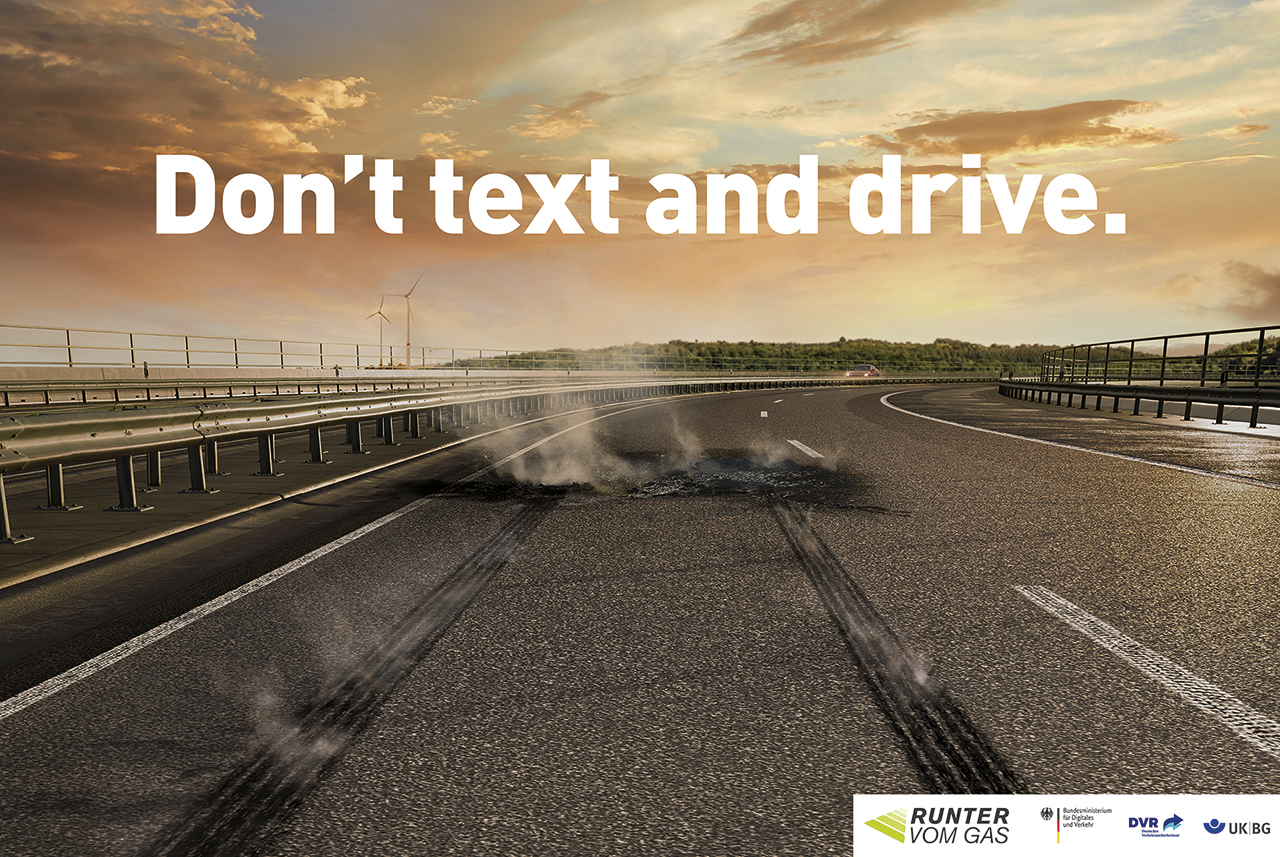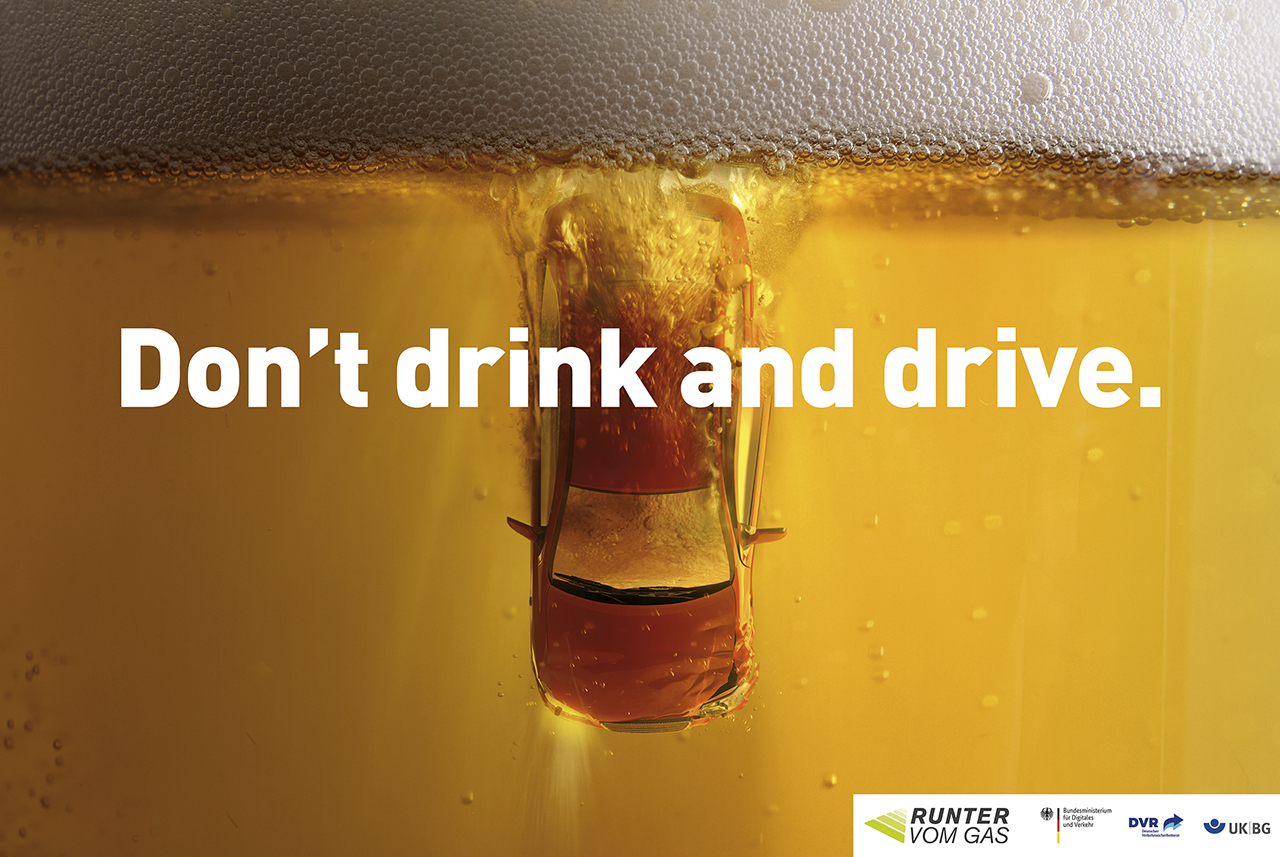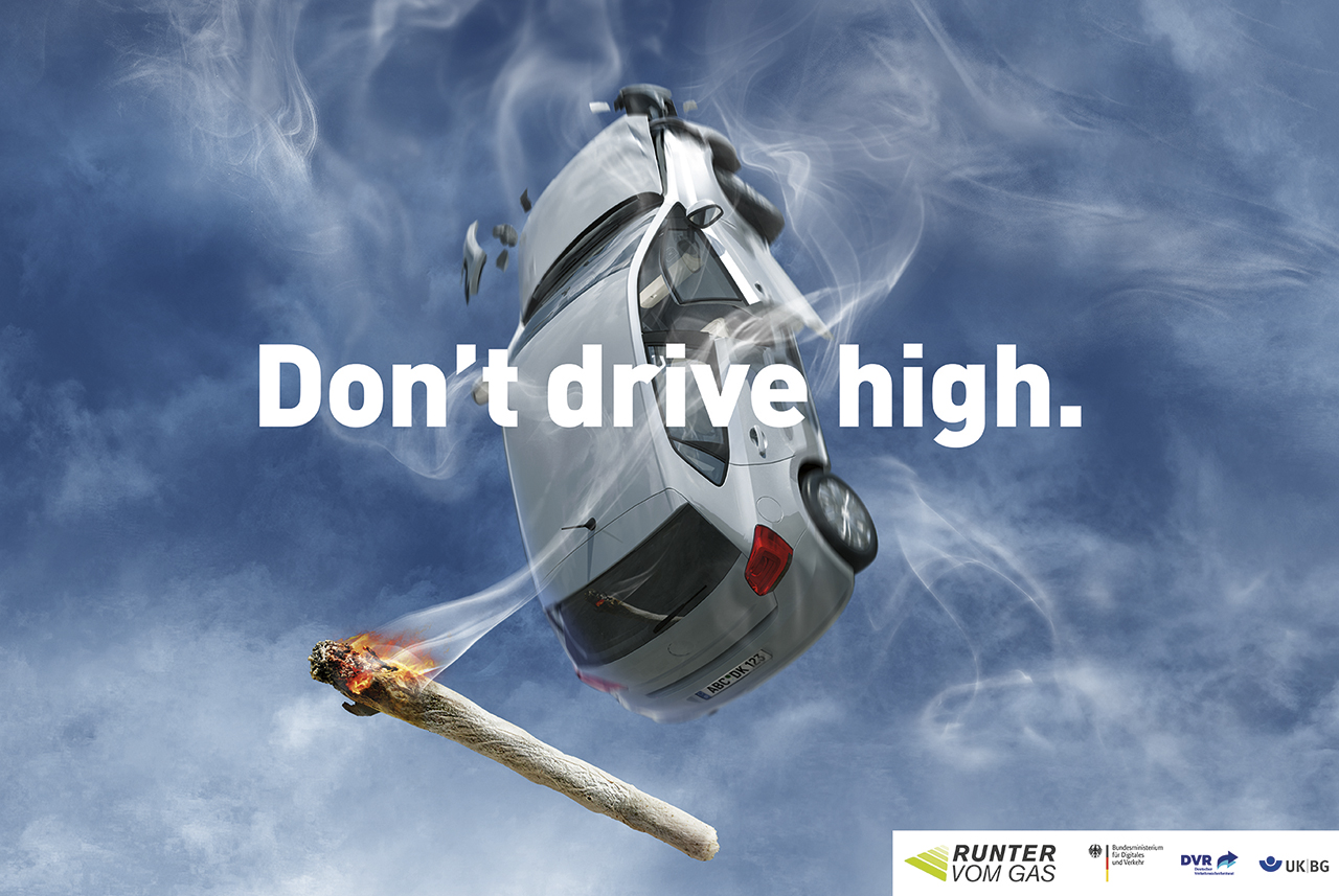 Die Bildmotive auf den Plakaten sind kreativ, aber meines Erachtens zu rätselhaft. Ein nicht maßstabsgetreuer Pkw, der – aus ungewohnter Perspektive, von oben dargestellt – nach unten in Bier mit Schaum obenauf fällt (nicht einmal die Kontur eines Bierglases wird als Dechiffrierhilfe gezeigt). Ein senkrecht in der Luft hängender Pkw, bei dem erst auf den zweiten Blick die abfallenden Fahrzeugteile erkennbar sind, von Rauchschwaden umhüllt und darunter ein überdimensionaler Joint, der auch eine schief gedrehte Zigarette sein könnte; dazu noch ein Wortspiel mit »high«. Und ein kryptischer, qualmender Fleck auf einer völlig leeren Fahrbahn, ohne Autowrack, nur eine Bremsspur.