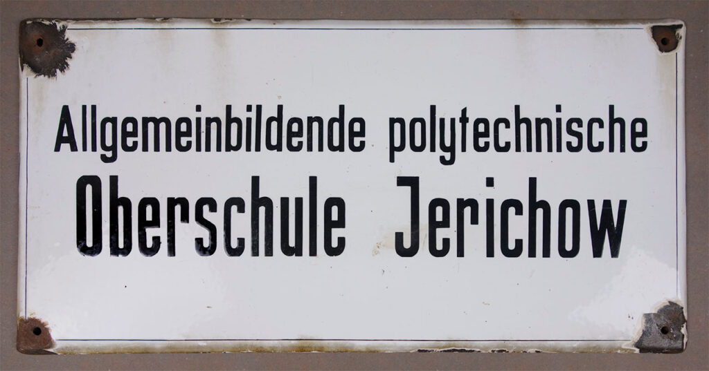 Zu Hause machte ich mich daran, den Schriftzug im Bild zu »restaurieren«. Zunächst suchte ich in Online-Schriftbibliotheken nach einer passenden Schrift, die ähnlich schmal proportionierte, rechteckige Zeichenformen aufweist, wie man sie an der Wand noch erahnen kann. Doch alle Font-Kandidaten wichen in maßgeblichen Details von der Vorlage ab. So begann ich, im Netz nach Fotos mit weiteren Beschriftungen aus der Region um das Kloster zu suchen – in der Hoffnung, dass solch eine Schrift noch andernorts auftaucht. Und tatsächlich fand ich ein historisches Emailleschild von einer Jerichower Schule mit einer bemerkenswert ähnlichen Type. Mit Hilfe der Buchstaben darauf baute ich dann die Textzeile auf der Wand annähernd nach. Im nachfolgenden Bild kann ihr Zustand vor und nach meiner Wiederherstellung per Klick/Mouseover verglichen werden.