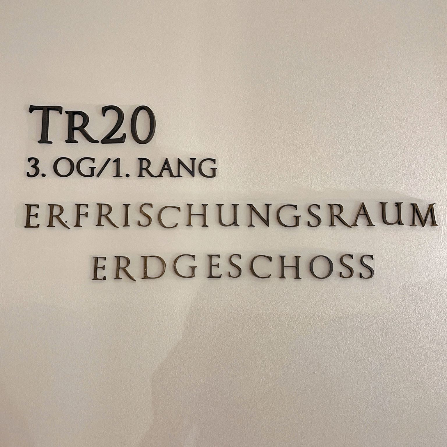 Diese Woche melde ich mich mit zwei typographischen Fundstücken aus München, wo ich sie während eines Besuches im Nationaltheater entdeckte. Zum einen ein ungewöhnlicher, aber sehr edel und klassisch anmutender Ü-Umlaut auf einem Schild an den Glastüren im Ausgangsbereich, zum anderen ein – vermutlich dem Zahn der Zeit geschuldetes – munteres Grundlinienballett bei einem Wegweiser aus einzelnen Metallbuchstaben an einer Wand im oberen Foyer. Aber da Ballett ja ebenfalls zum Genre des Musiktheaters zählt, passt es eigentlich trotzdem recht gut hierher … 🤭 🤓 🔠